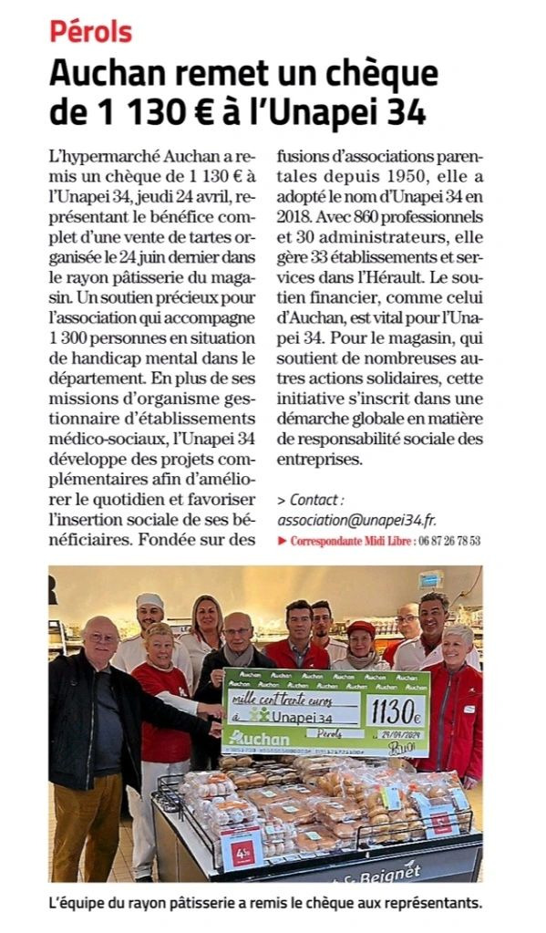 FAIRE UN DON Retour à la liste des actualités 26 février 202426 février 2026 Jeudi 24 avril, l’hypermarché Auchan de Pérols à remis un chèque de 1130€ à l’association, représentant le bénéfice d’une vente de tartes. C’est un soutien précieux pour l’association qui permettra de développer des projets complémentaires a destination des personnes en situation de handicap mental. Retrouvez l’article complet du Midi Libre juste en dessous.