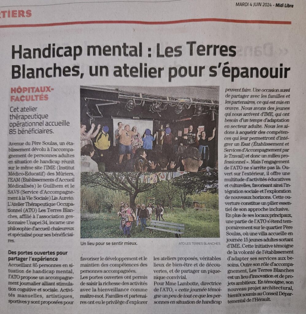FAIRE UN DON Retour à la liste des actualités 4 juin 202426 février 2026 L’ATO Les Terres Blanches qui accueille 85 personnes en situation de handicap mental a, il y a peu, organisé une journée portes ouvertes. Cette journée a été le moment pour chacun d’explorer les différents ateliers de l’ATO qui permettent au quotidien une simulation cognitive et sociale au travers d’activités manuelles, artistiques ou encore sportives. Cette journée a aussi été le moment de partager un pique nique convivial favorisant les échanges durant la journée. Anne Lambotte, directrice de l’ATO confie que c’est « une occasion aussi de partager avec les familles et les partenaires, ce qui est mis en oeuvre ». Mais l’ATO est aussi très ouvert sur l’extérieur, favorisant l’intégration sociale et l’exploration de nouveaux horizons au travers d’activités éducatives et culturelles. Cette ouverture au reste du monde fait écho aux valeurs de l’établissement en particulier celle d’avoir une approche inclusive. La volonté de l’ATO est claire, adapter ses services aux besoins des bénéficiaires. Ce sont tous ces éléments qui font de l’ATO les Terres Blanches un réel lieu d’innovation et de projets ambitieux. En accord avec ces deux qualificatifs, l’ATO a entamé un nouveau projet architectural qui sera soumis dans les prochains mois au Conseil Départemental de l’Hérault. Retrouvez l’intégralité de l’article du Midi Libre juste en dessous :