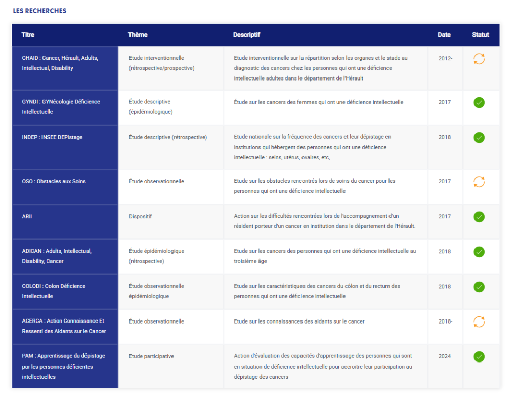 FAIRE UN DON Retour à la liste des actualités 24 février 202627 février 2026 ONCODÉFI regroupe des médecins spécialistes de la déficience intellectuelle et des cancers, des infirmières, des professionnels du secteur médico-social ainsi que des familles. L’association mène des recherches dans tous les domaines concernant la déficience intellectuelle et le cancer (épidémiologie, particularité des cancers, soins, prise en charge psychologique, biologie, etc…), particulièrement dans les secteurs où des informations manquent pour progresser dans les soins. Plus d’informations : https://oncodefi.org/ INTERVENTION D’ISCAO Iscao est un dispositif unique en France formé de deux infirmiers qui mènent des actions de sensibilisation et accompagnent les établissements médico-sociaux. Pourquoi ISCAO ? Les cancers sont aussi fréquents chez les personnes qui ont une déficience intellectuelle (PDI) que dans la population générale, mais ils sont différents et surtout mal connus, ce qui entraîne des difficultés de diagnostic et de prise en charge. Les cancers sont souvent découverts tardivement, et pour cette raison leur traitement est plus lourd, plus difficile et les chances de guérison moindres.Les difficultés sont accentuées par un manque de liens entre les équipes de soins des établissements sanitaires et les professionnels des établissements médico-sociaux. Le dépistage et la prévention des cancers prennent, pour cette raison, toute leur importance. ISCAO a été mis en place en janvier 2019 au sein d’Oncodéfi, association loi 1901, qui vise à une prise en charge optimale des cancers, depuis la prévention, le dépistage, jusqu’au traitement et son suivi, chez les personnes en situation de déficience intellectuelle. ISCAO est financé par l’ARS Occitanie, et inscrit dans le projet régional de santé (PRS) Occitanie. En 2016-2017, pendant une année, l’action-recherche ARII, a été menée par Oncodéfi en Hérault est assurée par Madame Anne Chanel infirmière employée par Oncodéfi et deux bénévoles Madame Sylvie Giordano directrice d’une institution médico-sociale et Madame Jocelyne Vianes infirmière cadre en oncologie, avec le soutien de la fondation Malakoff Médéric Handicap. ARII a montré les nombreuses difficultés à toutes les étapes du parcours de soins des personnes déficientes intellectuelles touchées par un cancer : Accompagnement, Prise de rendez-vous, Parcours diagnostic, Suivi thérapeutique et post thérapeutique. ISCAO intervient dans les institutions médico-sociales des 13 départements de la région Occitanie.